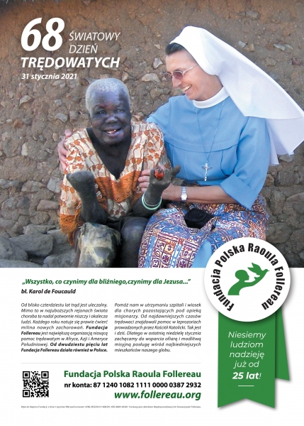 Ostatnia niedziela stycznia obchodzona jest w kościele katolickim jako Światowy Dzień Trędowatych. Jest to okazja do przypomnienia, że najstarsza choroba, o której zapomnieli już mieszkańcy większości krajów rozwiniętych, w najuboższych rejonach świat jest nadal groźna i wciąż zbiera swoje tragiczne żniwo. Dokładna liczba chorych na trąd nie jest znana, jako że występuje on w krajach o słabo rozwiniętych systemach opieki zdrowotnej, gdzie rodzą się dzieci, które nie mają szans, by w życiu spotkać lekarza. Tam docierają najodważniejsi misjonarze. Przez całe stulecia trędowaci znajdowali schronienie przy kościołach i klasztorach, gdzie powstawały pierwsze leprozoria. Idąc za Chrystusem, który litując się nad trędowatymi uzdrawiał ich, wielcy święci nie bali się zbliżać do tych, których sam widok wywoływał paniczny lęk i trwogę. Św. Franciszek z Asyżu, św. Ludwik, św. Maurycy, św. Elżbieta Węgierska, św. Kinga, św. o. Damian i św. Marianna Cope z wyspy Molokai, św. Teresa z Kalkuty stanowią dziś inspirację dla misjonarzy pracujących wśród trędowatych w Azji, Afryce, Ameryce Południowej czy na dalekich Wyspach Pacyfiku.